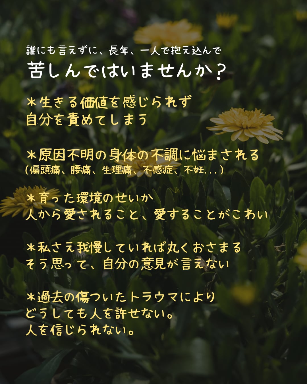 魂・心・肉体レベルで、三位一体となるバランスを整えていくヒーリングです。潜在意識(無意識)と繋がり、必要のない思考や感情を解放していくので、勝手に波動域が整えられて、本来のわたし(魂)の輝きを取り戻して頂けます。
